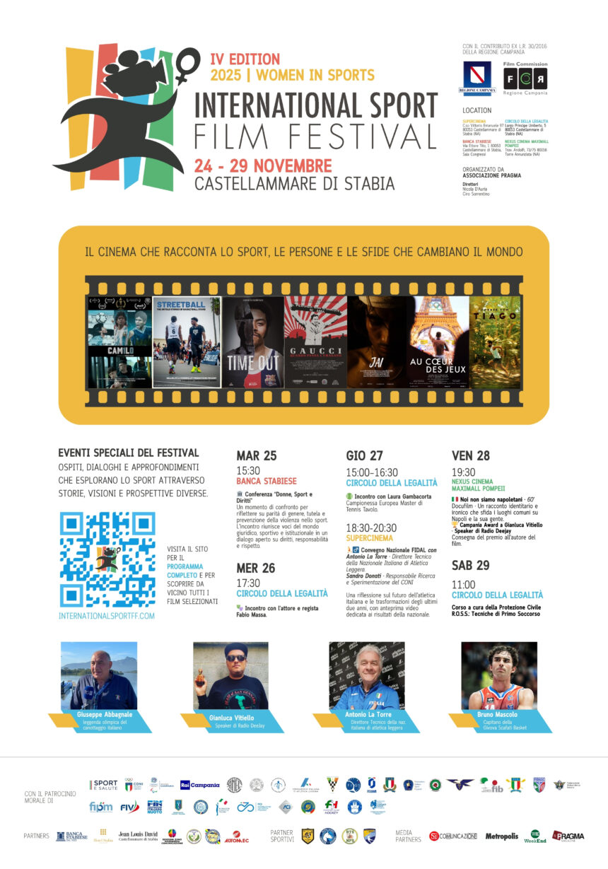 Dal 24 al 29 novembre Castellammare di Stabia torna a essere capitale del cinema sportivo con la quarta edizione dell’International Sport Film Festival. Per un’intera settimana la città si trasformerà in un vivace punto d’incontro tra cinema, sport e cultura, accogliendo proiezioni e incontri in diverse location: Supercinema, Circolo della Legalità, Sala Convegni Banca Stabiese e Nexus Maximall di Torre Annunziata. Il pubblico potrà assistere alle opere finaliste provenienti da tutto il mondo, tra film, documentari e cortometraggi dedicati allo sport in tutte le sue declinazioni.